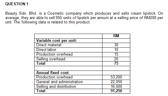 Beauty Sdn. Bhd. is a Cosmetic company which produces and sells cream lipstick. On average, they are able to sell 950 units of lipstick per annum at a selling price of RM200 per unit. The following data is related to this product.